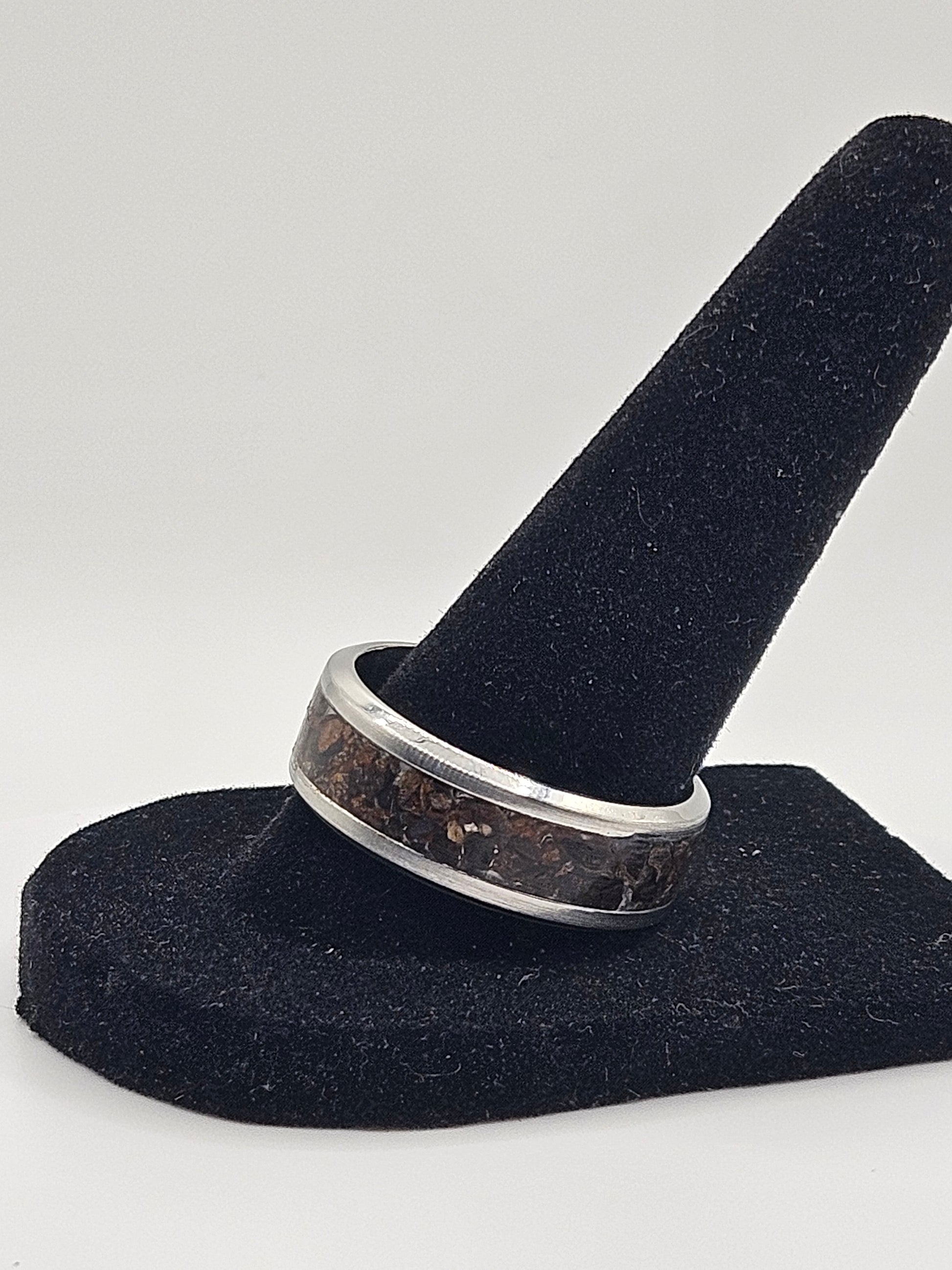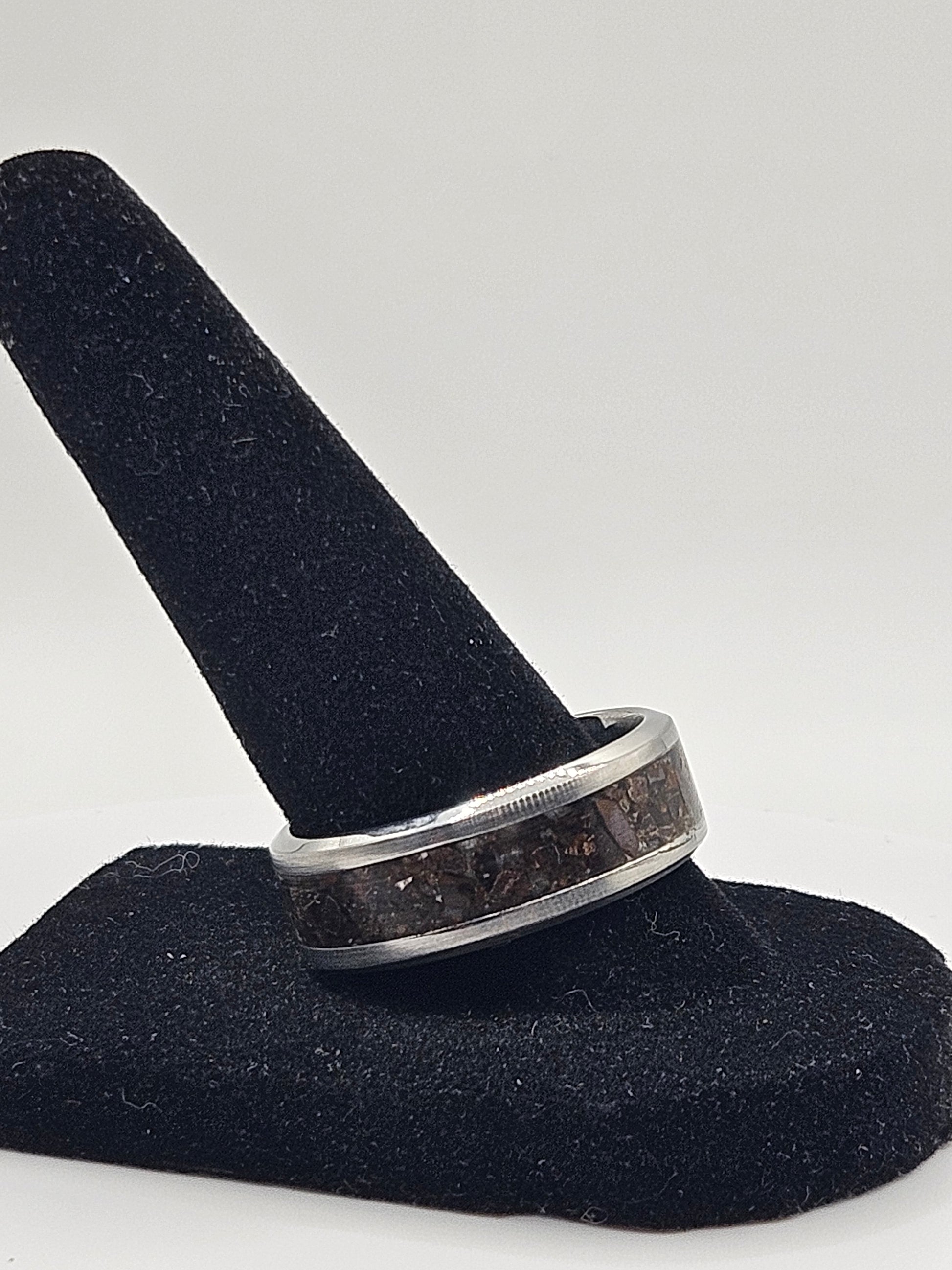 This Crushed T-Rex Bone Stainless Steel Ring features a unique fossil inlay design. The ring is crafted from stainless steel, ensuring durability and a sleek appearance. It comes in sizes 4.5-12 with widths 8mm,6mm, and 2mm making it a standout piece. The fossil inlay adds a touch of natural beauty and intrigue to the ring. Perfect for those who appreciate distinctive jewelry.